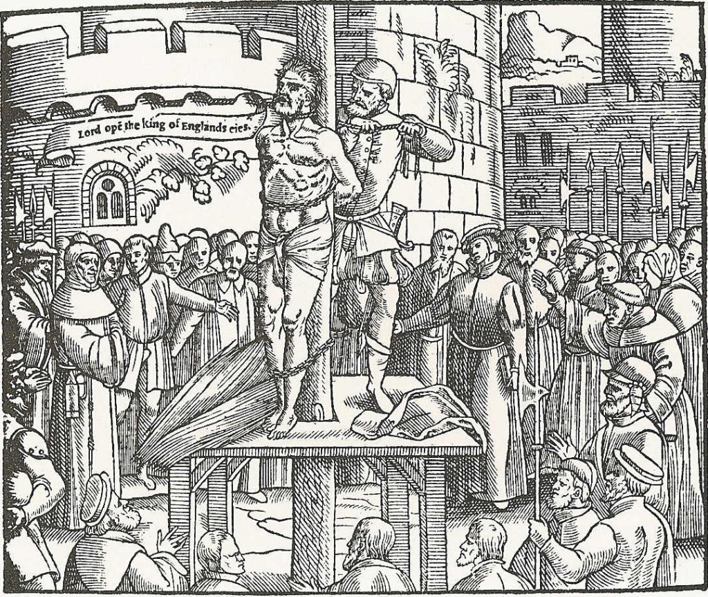 Pictured Above- William Tyndale was promised to be able to print an English Bible from King Henry VIII’s abode. However, King Henry VIII wanted to print his own version. Tyndale was eventually convicted of Heresy for believing in the forgiveness of sins and that the Gospel provided mercy and was enough for salvation. He was sentenced to death for his beliefs in Christian Doctrine and was betrayed by King Henry VIII.